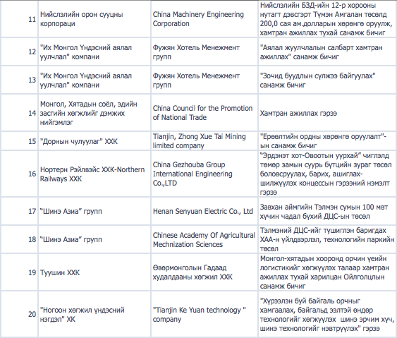 Хоёр орны аж ахуйн нэгжүүд байгаль орчин, уул уурхай, усан хангамж, гэр хорооллын дахин төлөвлөлт, худалдаа, зочид буудал, барилга, мах, махан бүтээгдэхүүн боловсруулах үйлдвэр, төмөр зам, эрчим хүч, банк, санхүү, аялал жуулчлал зэрэг чиглэлээр хамтран ажиллах юм. Тухайлбал Бөөрөлжүүтийн Дулааны цахилгааны станцийн төсөлд “Бодь Интернешнл” ХХК, “China State Consruction Engineering” компанитай хамтран ажиллах 450 орчим сая ам.долларын өртөг бүхий гэрээнд гарын үсэг зурлаа.