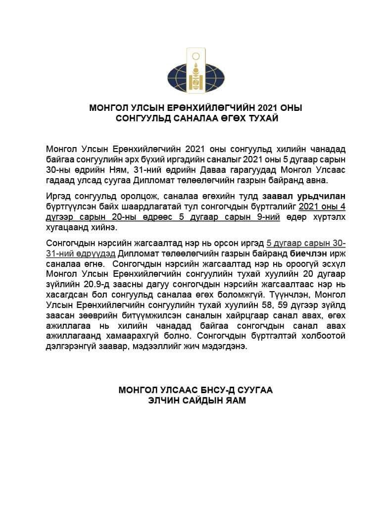 Монгол Улсын Ерөнхийлөгчийн 2021 оны сонгуульд хилийн чанадад байгаа сонгуулийн эрх бүхий иргэдийн саналыг тавдугаар сарын 30, 31-нд авах юм.