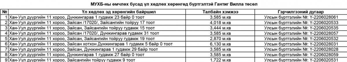 Тэгвэл тус хотхоны Хөгжлийн банкны эзэмшилд шилжүүлсэн 9 блок барилгын байршил болон метр квадратын мэдээллийг хүргэж байна.
