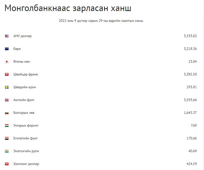 Өнгөрсөн Даваа гарагт 3,248.97 төгрөг байсан Монголбанкны албан ханш ийнхүү 3,333 болж, 85 төгрөгөөр нэмэгджээ.
