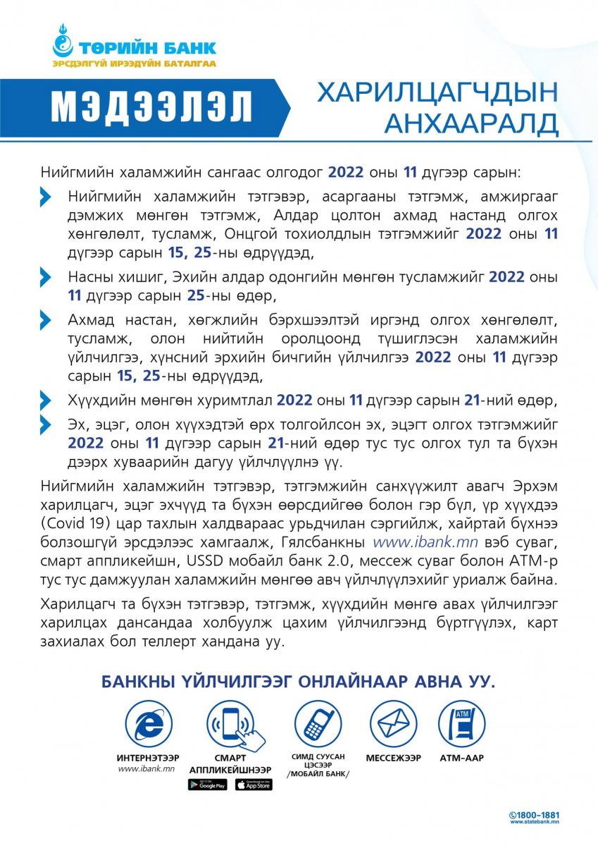 Хөдөлмөр халамжийн үйлчилгээний ерөнхий газраас нийгмийн халамжийн тэтгэвэр, тэтгэмж, хөнгөлөлт, тусламжийн 2023 оны хоёрдугаар сарын олголтын хуваарийг тан [...]
